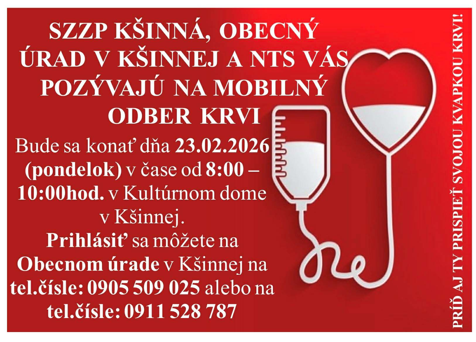 Pozývame Vás všetkých, ktorí ste ochotní darovať kúsok seba v prospech zdravia iných, na mobilný odber krvi, ktorý sa bude konať v pondelok 23.februára 2026 v čase od 8:00 do 10:00 hod. v kultúrnom dome v Kšinnej.